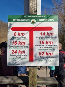 Auch dieses Jahr nahm die Wandergruppe wieder am Sachsendreier teil. Es wurde sich für die Kriebsteinrunde und die Sauergrasrunde entschieden. Die Wanderung verlief entlang der Zschopau auf dem Wanderweg „Kreuzfelsen“ zum Diedenheimer Viadukt. Danach auf Burg Kriebstein konnten sich die Wanderer stärken um das nächste Ziel, den Wachbergturm zu erreichen. Start und Ziel war das Stadt & Museumshaus Waldheim. Bei bestem Wanderwetter erreichten nach 8 oder 16 km alle Wanderer das Ziel.