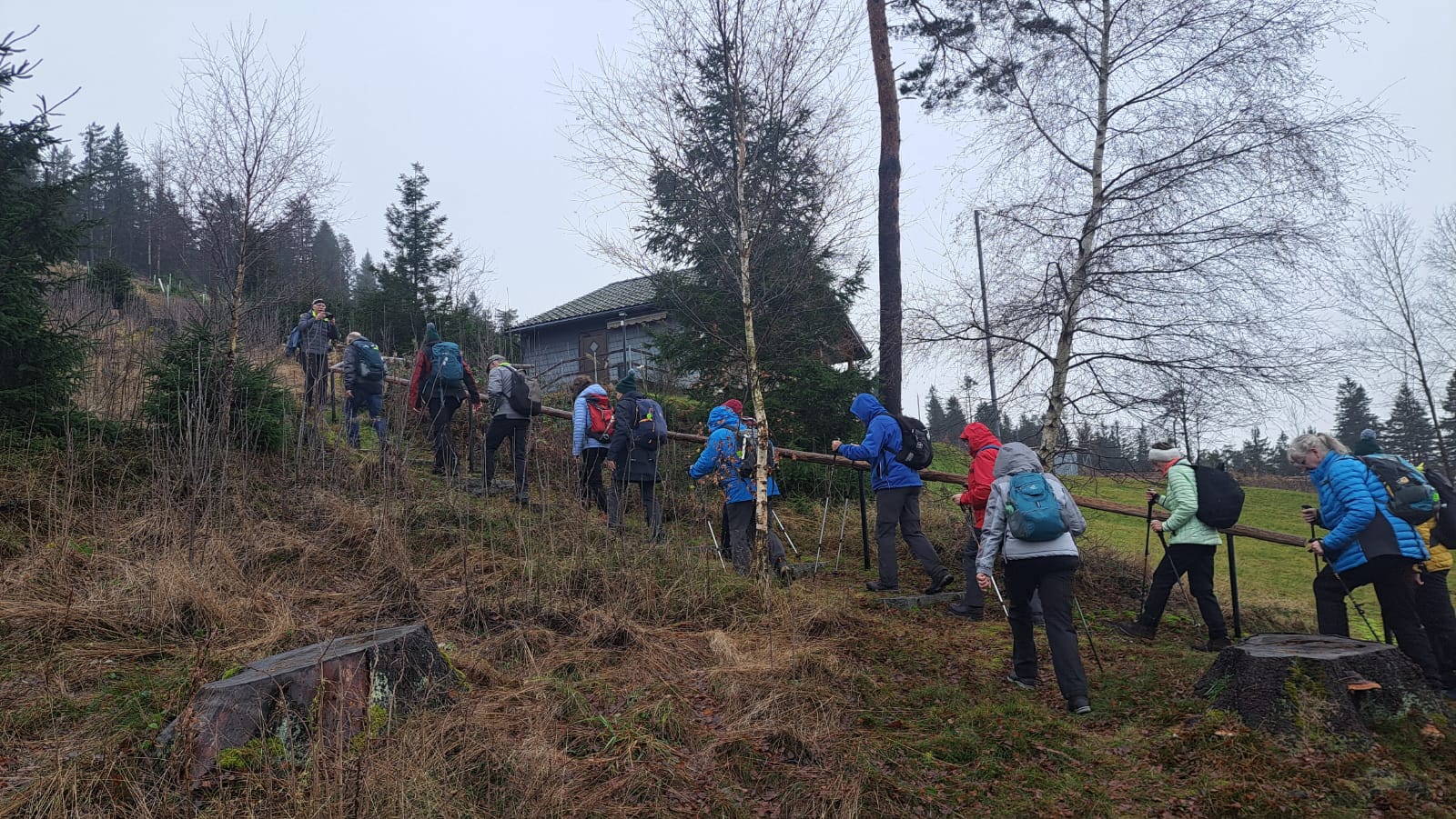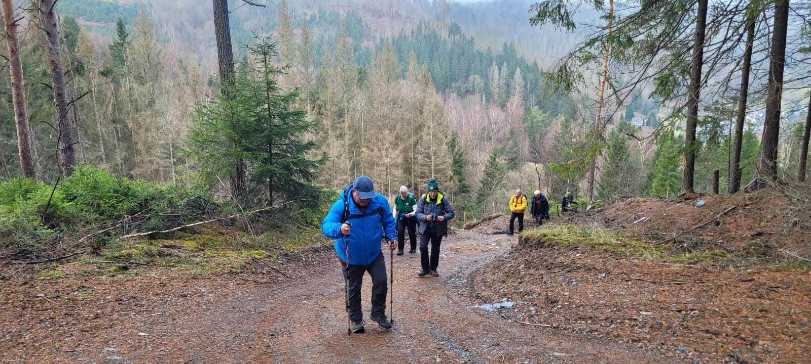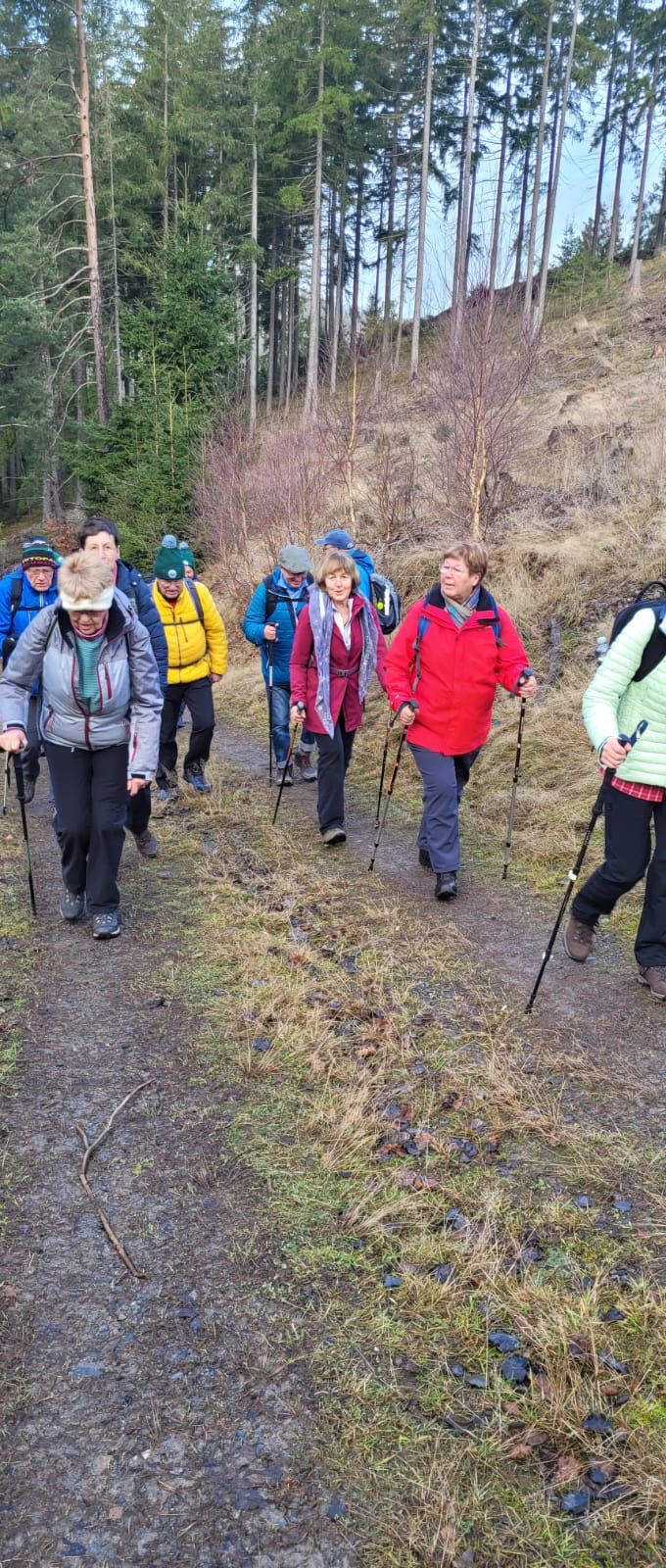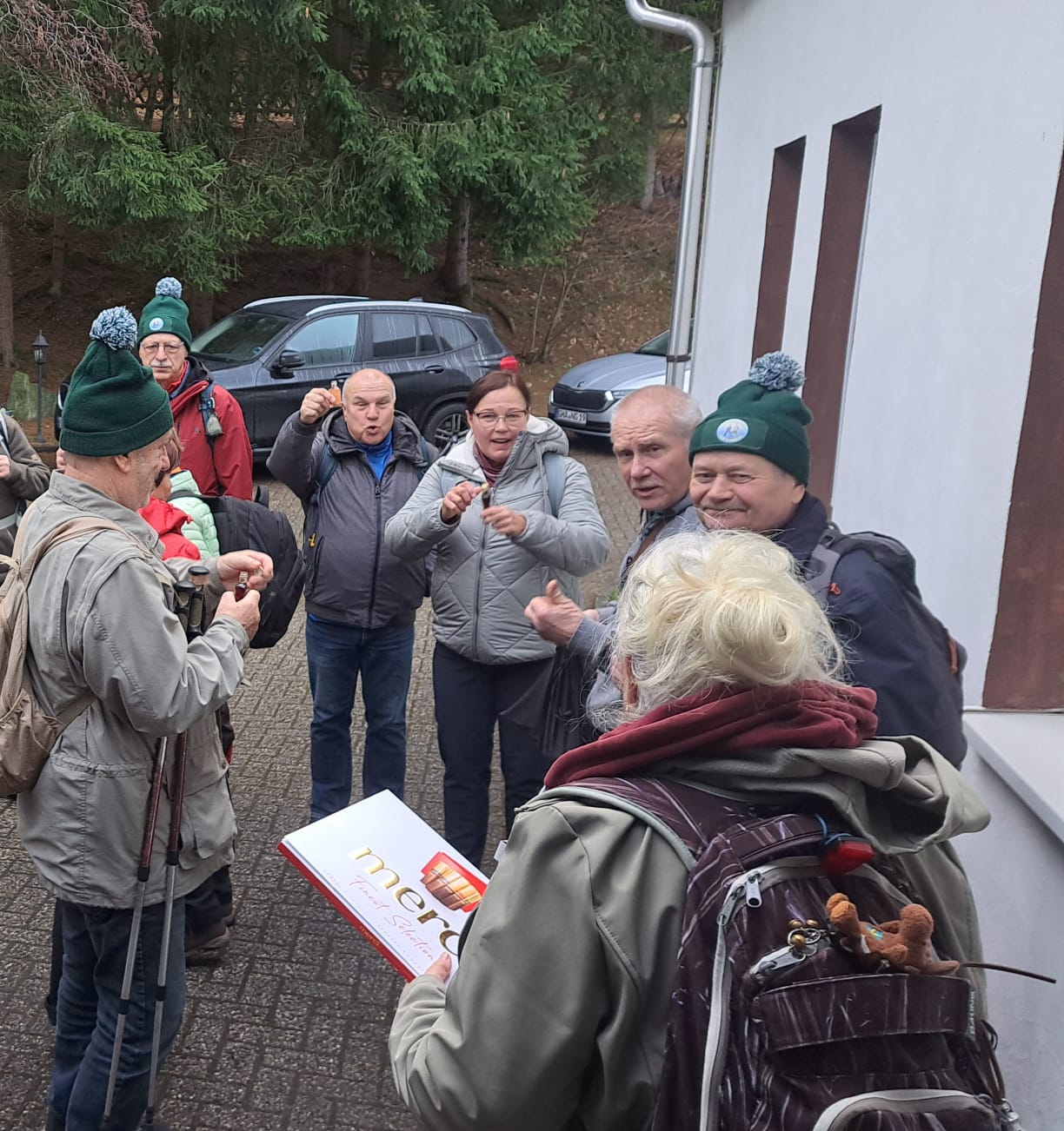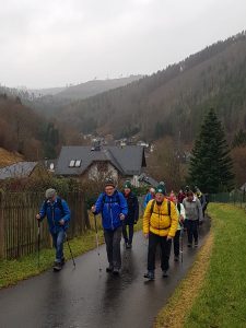 Startpunkt war das Hotel, von dem aus der Aufstieg über den Meilerberg in Richtung Meusbacher Kuppe begann. Der Anstieg war recht anspruchsvoll, mit zunehmender Steigung von bis zu 20% auf dem Weg durch den Wald. Die Wolken hielten die Sicht teilweise gering, doch die Gruppe behielt den Überblick über die Route und blieb auf den markierten Wegen. Von dort ging es weiter in Richtung Viehberg, hinein ins Tal der Weißen Schwarza bis zum Forellenhof Bartnik. Hier stärkten sich die Wanderer mit Forelle (auf verschiedenste Art zubereitet) und Schnitel. Wir wurden super betreut und genossen die Atmosphäre und das leckere Essen. Der Rückweg begann mit der Weiterwanderung zum Bahnhof Katzhütte. Von dort mit dem Bus nach Mellenbach/Glasbach und anschließend der Rückweg zum Hotel durch den Wald. Nach dem Abendessen gab es einen kleinen Quiz und den Rückblick auf das vergangene Wanderjahr mit einer liebvoll gestalteten Fotoshow.