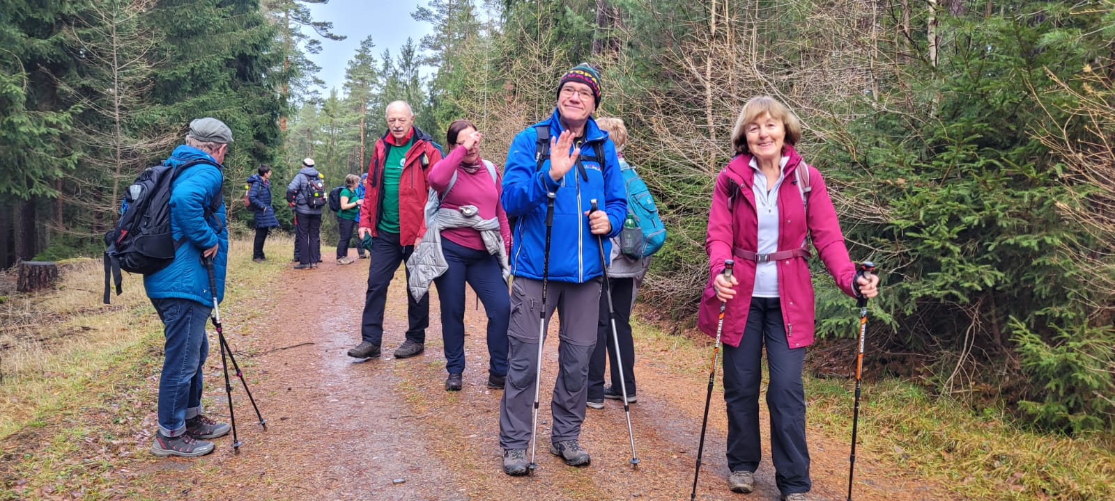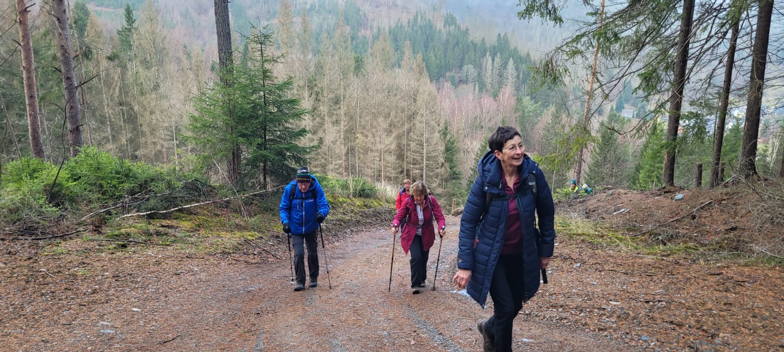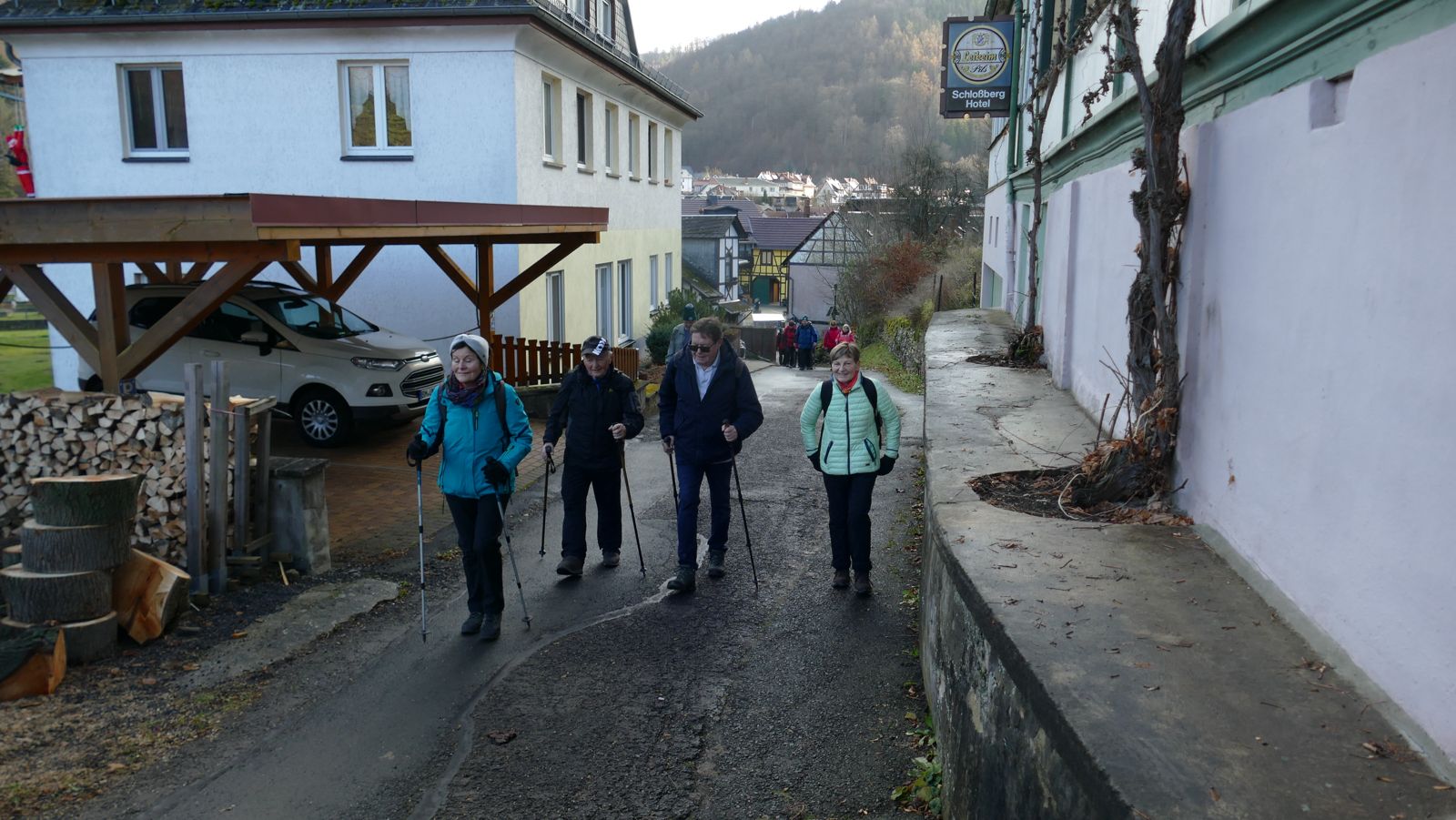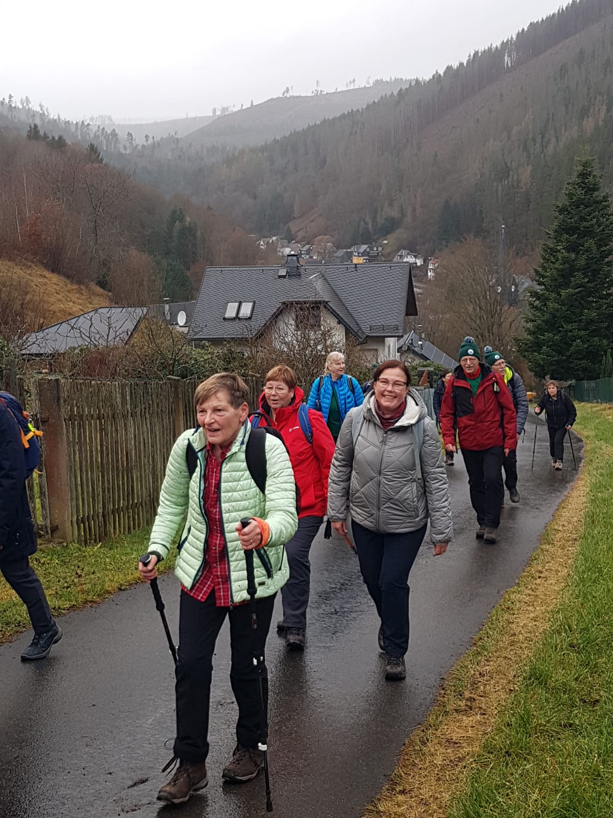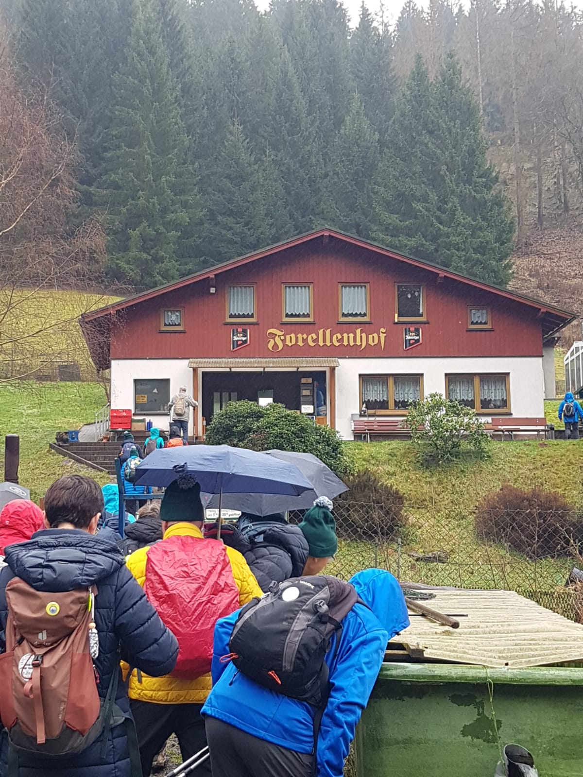 Startpunkt war das Hotel, von dem aus der Aufstieg über den Meilerberg in Richtung Meusbacher Kuppe begann. Der Anstieg war recht anspruchsvoll, mit zunehmender Steigung von bis zu 20% auf dem Weg durch den Wald. Die Wolken hielten die Sicht teilweise gering, doch die Gruppe behielt den Überblick über die Route und blieb auf den markierten Wegen. Von dort ging es weiter in Richtung Viehberg, hinein ins Tal der Weißen Schwarza bis zum Forellenhof Bartnik. Hier stärkten sich die Wanderer mit Forelle (auf verschiedenste Art zubereitet) und Schnitel. Wir wurden super betreut und genossen die Atmosphäre und das leckere Essen. Der Rückweg begann mit der Weiterwanderung zum Bahnhof Katzhütte. Von dort mit dem Bus nach Mellenbach/Glasbach und anschließend der Rückweg zum Hotel durch den Wald. Nach dem Abendessen gab es einen kleinen Quiz und den Rückblick auf das vergangene Wanderjahr mit einer liebvoll gestalteten Fotoshow.