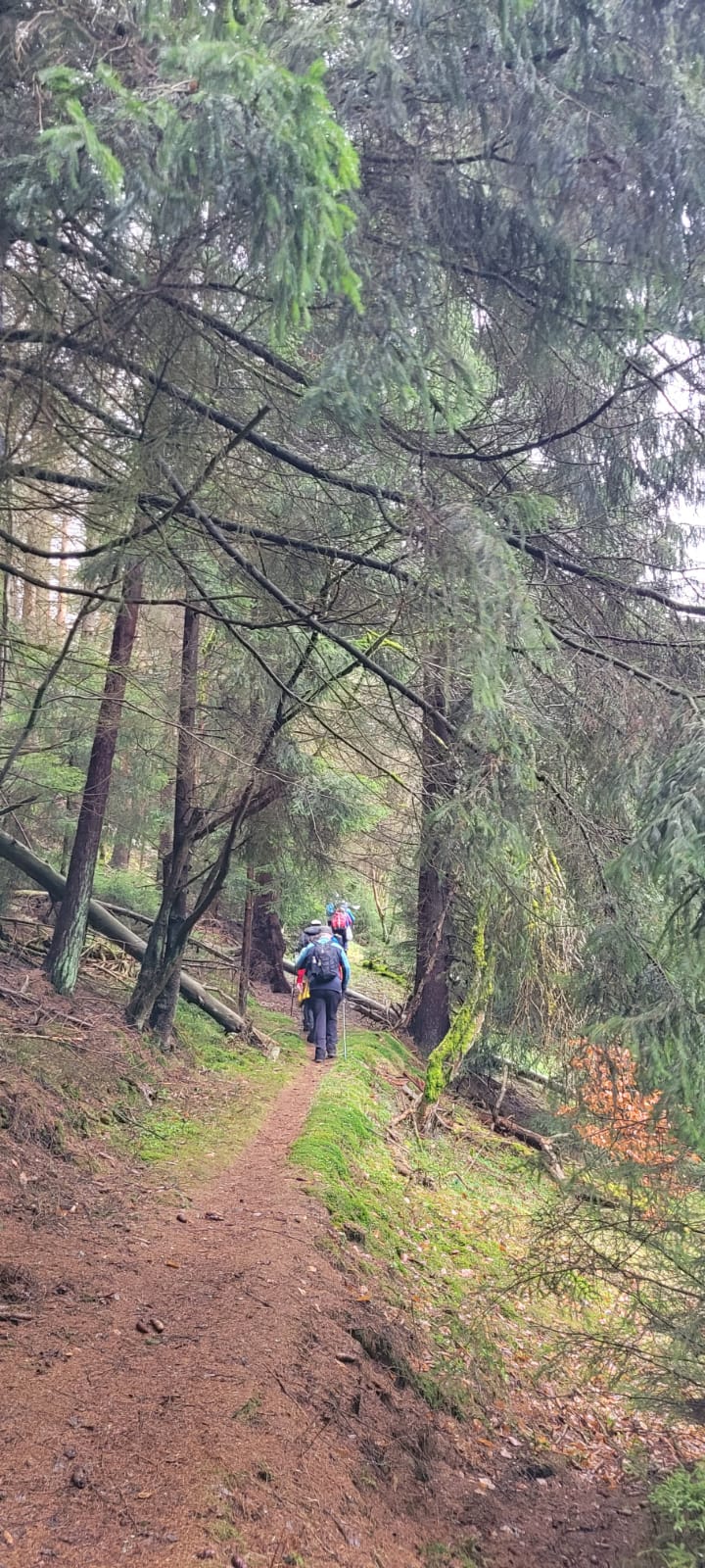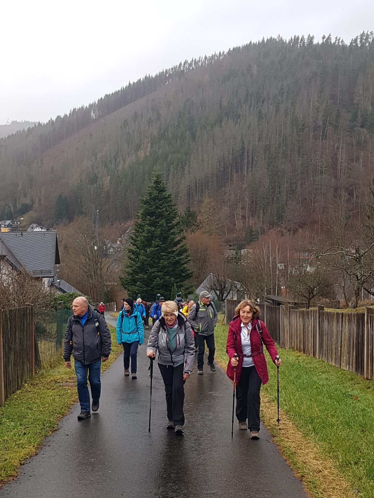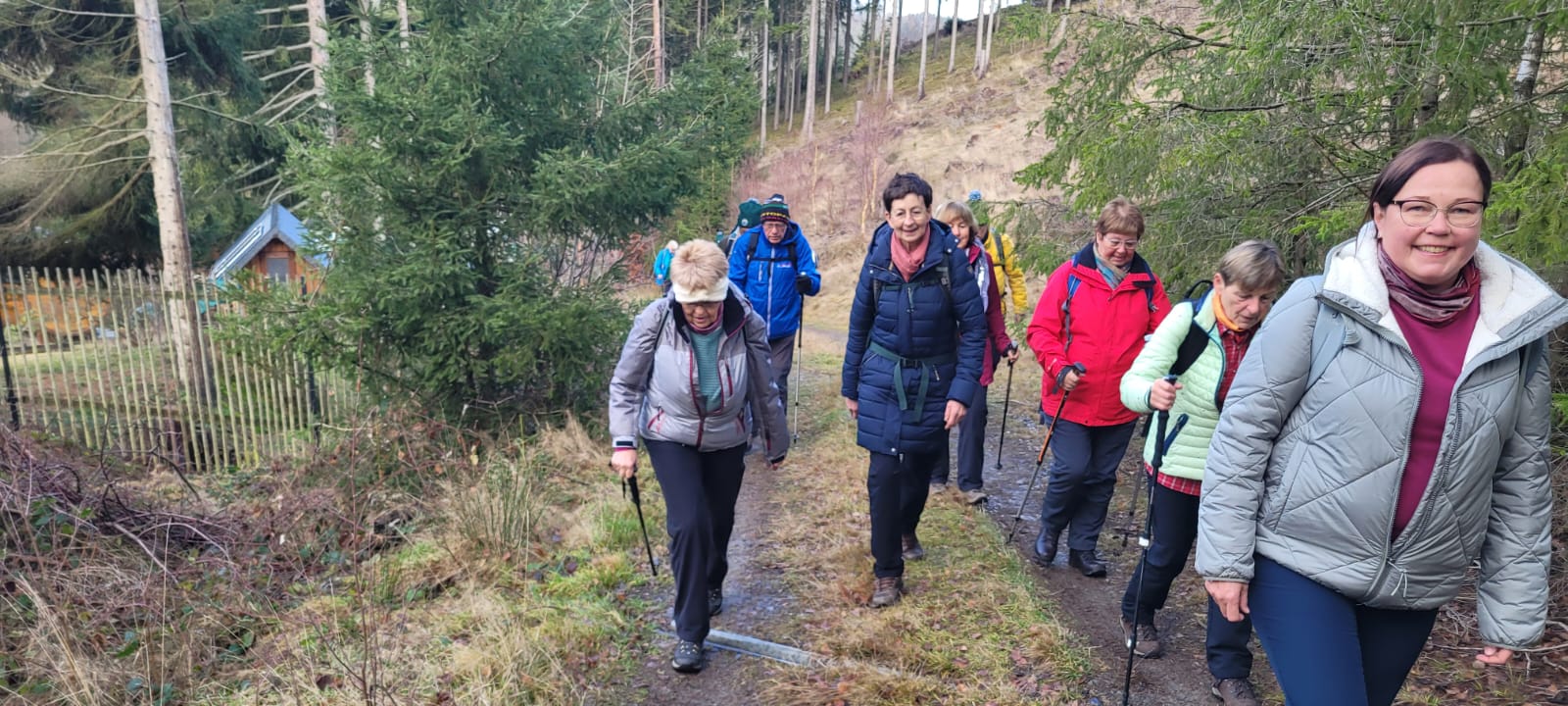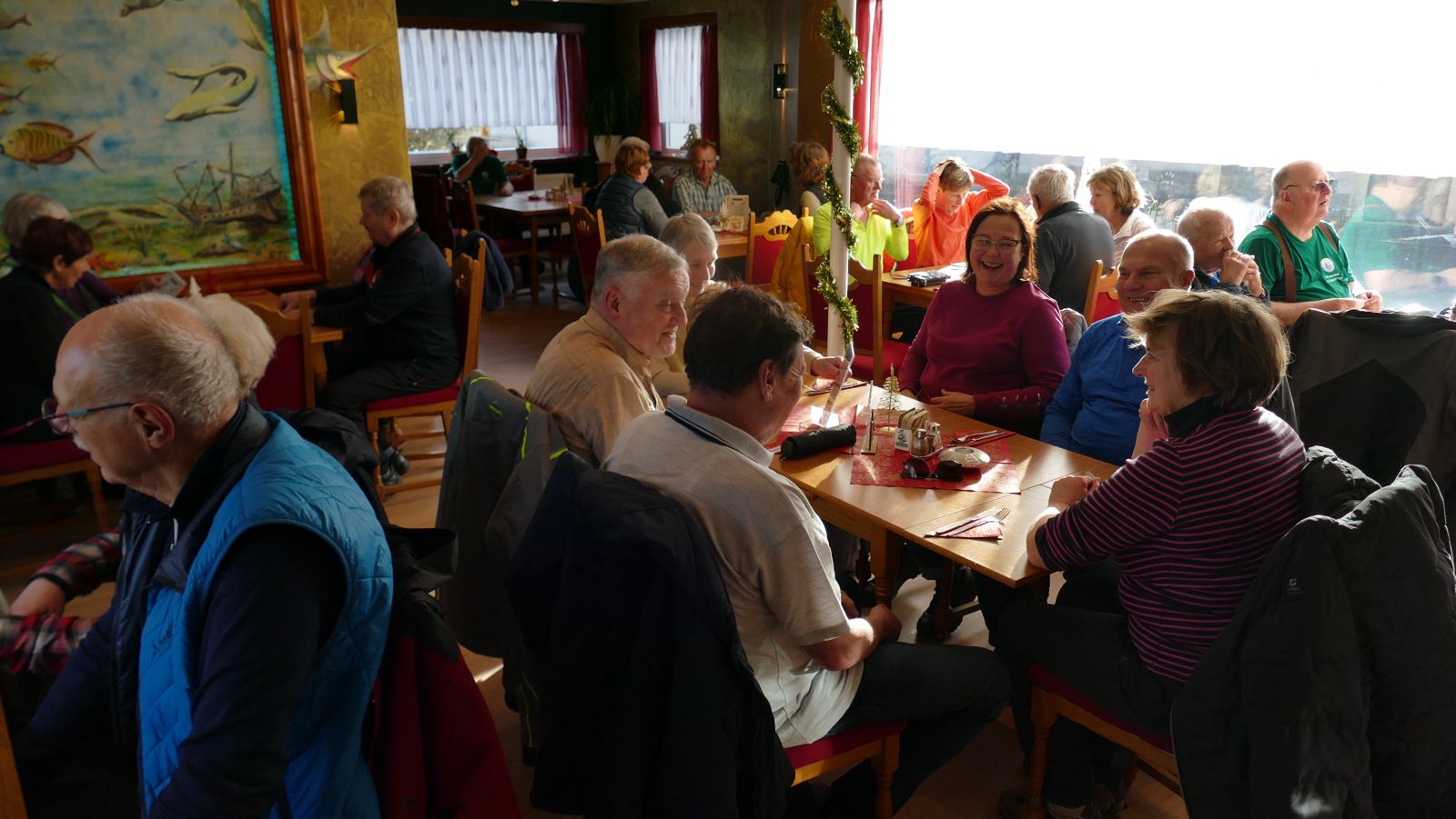 Startpunkt war das Hotel, von dem aus der Aufstieg über den Meilerberg in Richtung Meusbacher Kuppe begann. Der Anstieg war recht anspruchsvoll, mit zunehmender Steigung von bis zu 20% auf dem Weg durch den Wald. Die Wolken hielten die Sicht teilweise gering, doch die Gruppe behielt den Überblick über die Route und blieb auf den markierten Wegen. Von dort ging es weiter in Richtung Viehberg, hinein ins Tal der Weißen Schwarza bis zum Forellenhof Bartnik. Hier stärkten sich die Wanderer mit Forelle (auf verschiedenste Art zubereitet) und Schnitel. Wir wurden super betreut und genossen die Atmosphäre und das leckere Essen. Der Rückweg begann mit der Weiterwanderung zum Bahnhof Katzhütte. Von dort mit dem Bus nach Mellenbach/Glasbach und anschließend der Rückweg zum Hotel durch den Wald. Nach dem Abendessen gab es einen kleinen Quiz und den Rückblick auf das vergangene Wanderjahr mit einer liebvoll gestalteten Fotoshow.